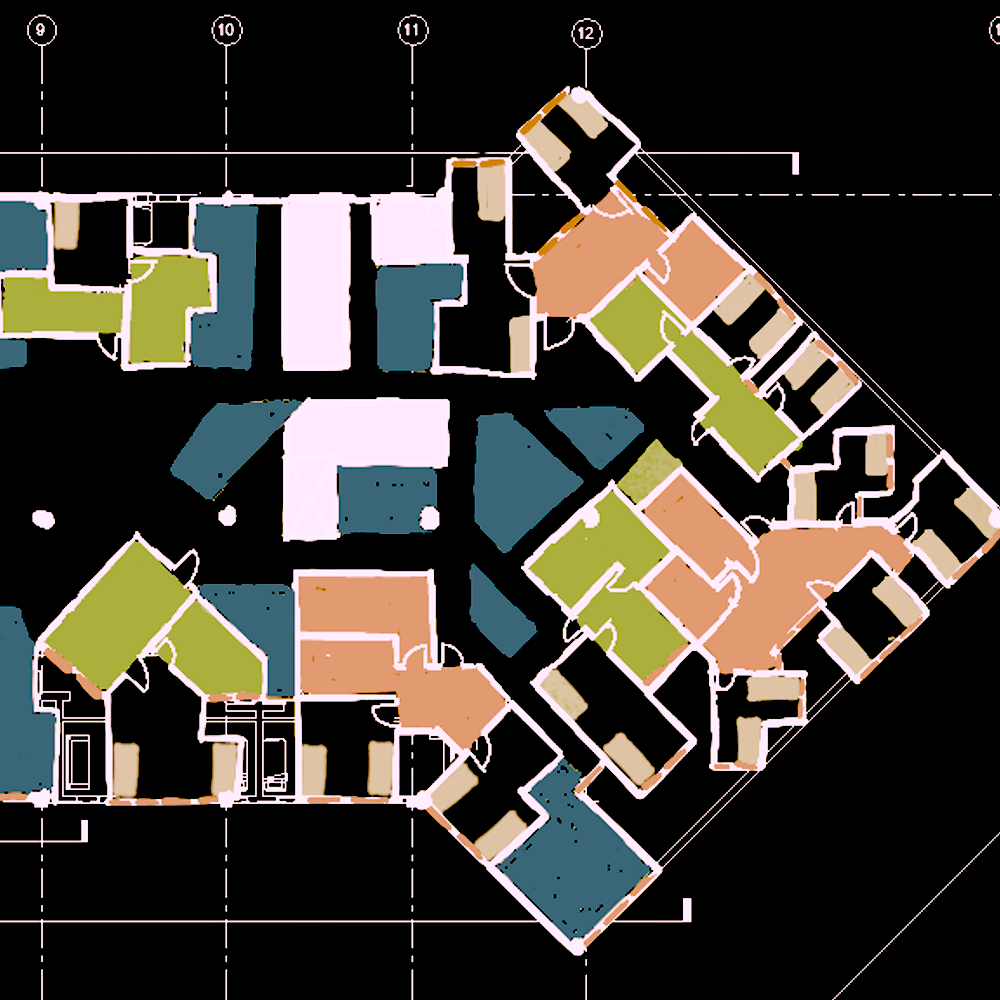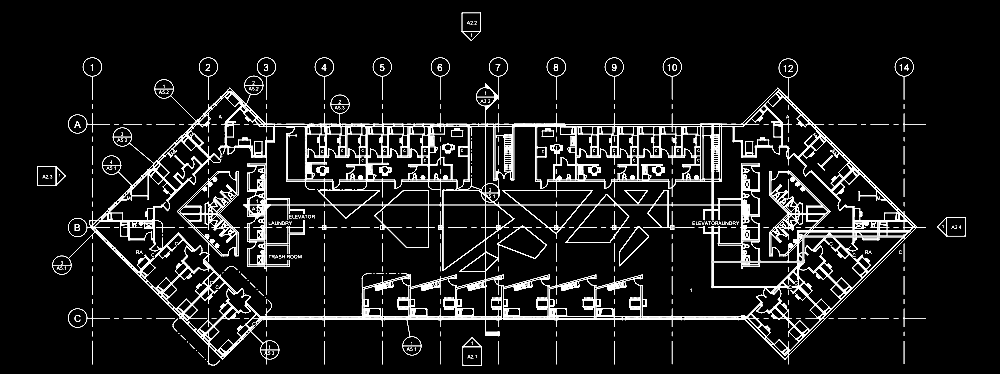 Our professor had strongly suggested that we make our building smaller, yet having already put in the room walls, the showers, the toilets, some windows, we would have to delete everything and start from scratch. I received the suggestion to come up with a floor plan that every floor from levels 3-6 would remain the same. We had an assignment that required us to have all of our floor plans ready to present, and so, my teammate gave me the job to create the floor plans for each assignment. Below is a portion of what I created for levels 3-6 of this dormitory. What this floor plan would accomplish would be making sure that each living space had it’s own window, fit 50 beds in the left-and-right sides leaving plenty of room for community lounges in the center, allowed each bedroom to have windows, and avoided common bathrooms. The plan even considered a trash room and 2 laundry rooms.