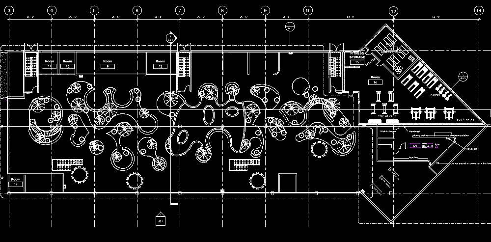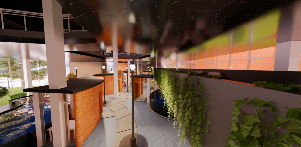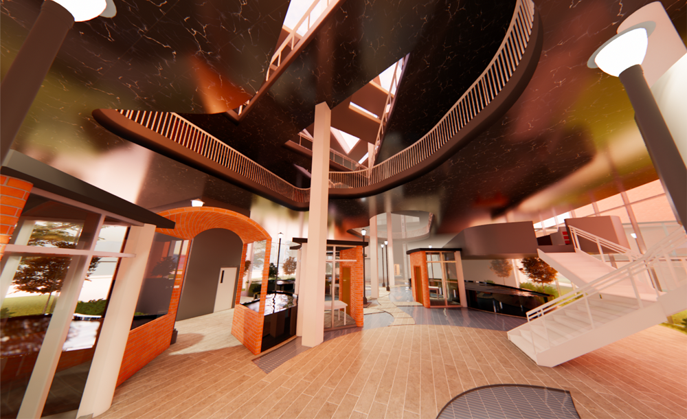 In the process of working on the floor plans for the building, I had also came up with a concept for the level 1 floor plan. The idea was to bring the “outside in”. To come up with these curvy shape designs, I had to first draw a design on a drawing software, import it into revit, and use the curved-line tool to edit the floor borders. I then experimented with how to create a curved staircase, and implemented that into our building.